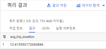 이 결과를 보면 뉴욕에서 남성 사용자가 평균적으로 자전거를 대여하는 시간이 약 13.4분임을 알 수 있다. 그러나 데이터셋은 지속적으로 갱신되므로 이 쿼리를 실행하는 시점의 결과는 다를 수 있다.